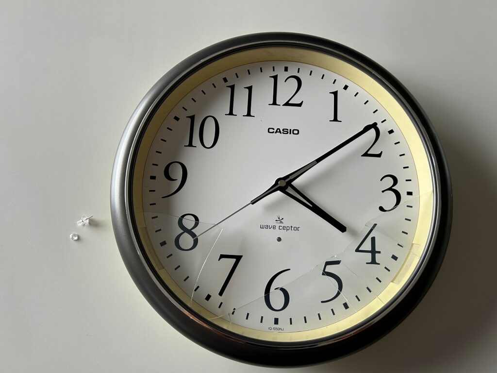 « 1級施工管理技士試験 スイッチ交換工事 » 時の変化 株式会社アスクの中村です 先日会社の時計が、落下して破損してしまいました 原因は、留めていたピンが折れたことの様です なんだか縁起悪いな~と思いつつ、幸い創立記念日前日だったので 20周年に向け「時の変化を起こせ」というメッセージだと前向きに捉えることにしました